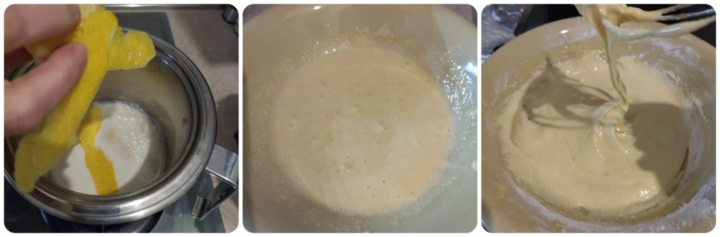En este punto vierte la leche caliente en la mezcla de huevos (para evitar que las pieles caigan en el bol usa un colador), mezcla bien, vuelve a poner en el cazo al fuego y cocina a fuego medio/bajo por unos minutos, removiendo a menudo. Yo también añadí la cáscara rallada de medio limón para dar más sabor.