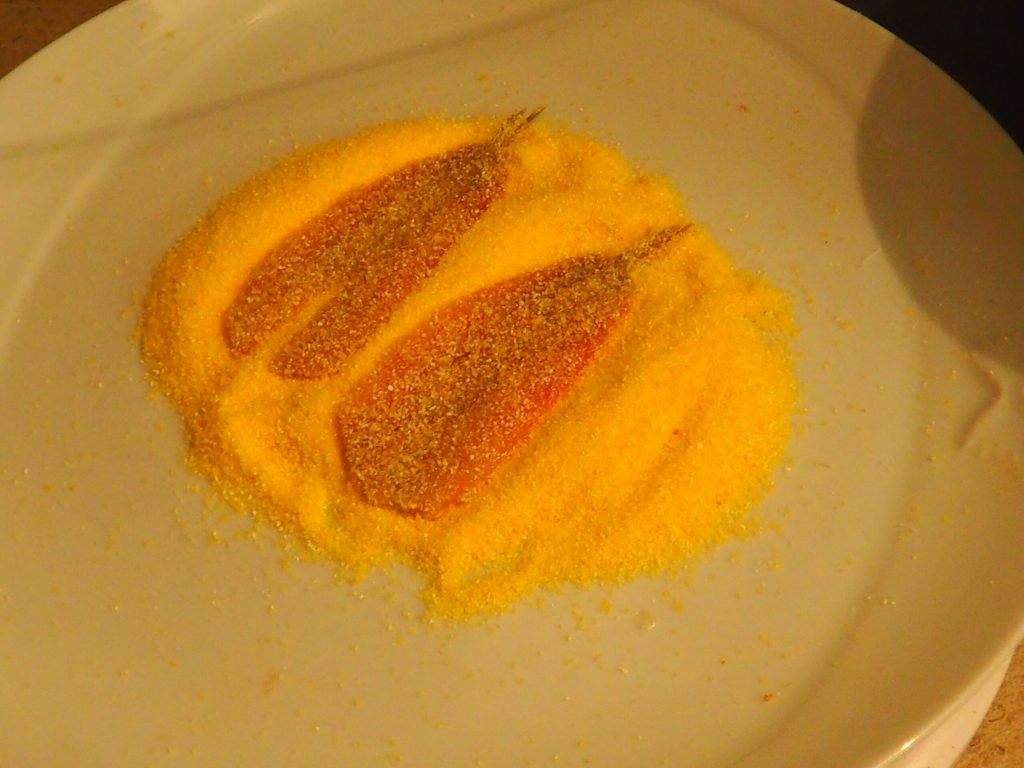 En un plato poned la harina de maíz (la que se usa para preparar la polenta), pasad cada filete de boquerones de manera que quede cubierto por ambos lados. Presionad ligeramente para que la harina se adhiera mejor. No sazonéis ahora los boquerones, se volverían blandos y no crujientes.