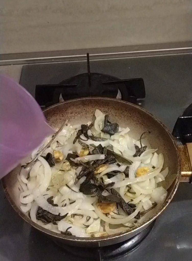 Ahora prepara la marinada. En una sartén con un poco de aceite de oliva pon las hojas de salvia, los dientes de ajo y la cebolla cortada en rodajas y sofríe ligeramente. Añade el vinagre, el agua, la sal y deja cocinar durante unos 15 minutos.