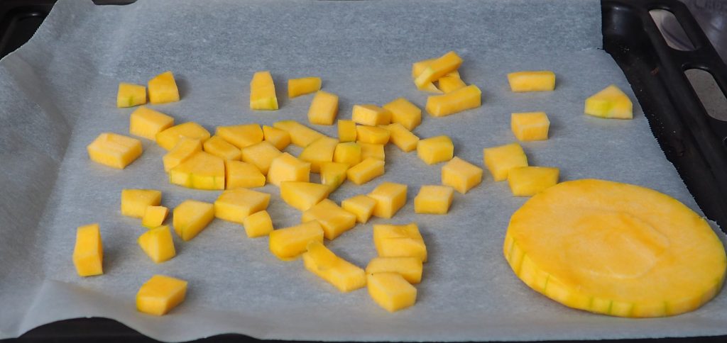 Lava la calabaza, pélala (yo uso el pelador), córtala en rodajas gruesas, luego en cubitos, colócalos en la bandeja del horno cubierta con papel de horno y cocina a 180° durante unos 15 minutos.