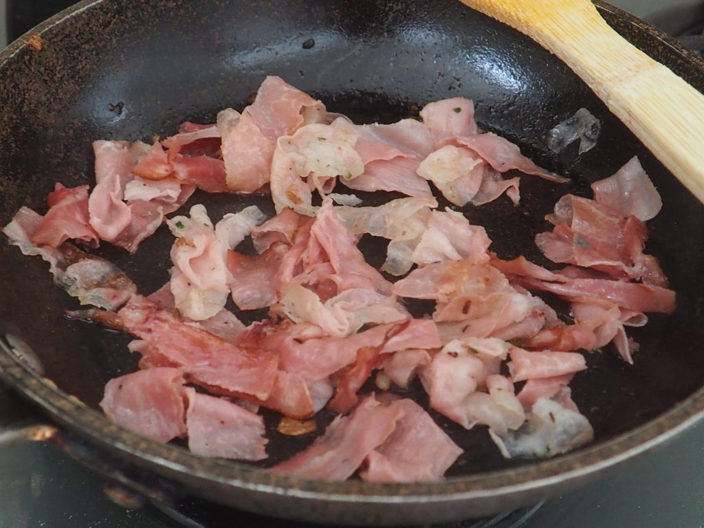 Dorad el speck cortado en tiras en una sartén bien caliente.