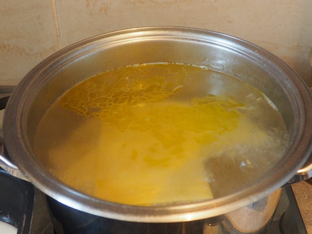 Pon abundante agua en una olla, cuando hierva añade la sal, el aceite y las láminas.