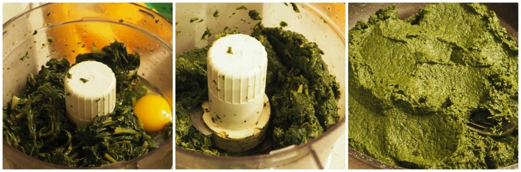 Dejad enfriar ligeramente las espinacas, ponedlas en una batidora añadiendo un huevo y trituradlas hasta obtener una mezcla suave y homogénea.