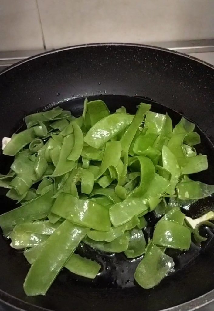 En una sartén pon un poco de aceite, los dientes de ajo y añade las cáscaras de guisante.