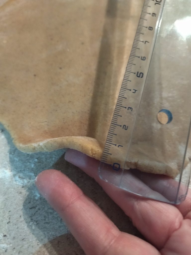 Dividid la masa en dos partes, extendidlas con un rodillo a una altura de aproximadamente 5 mm.