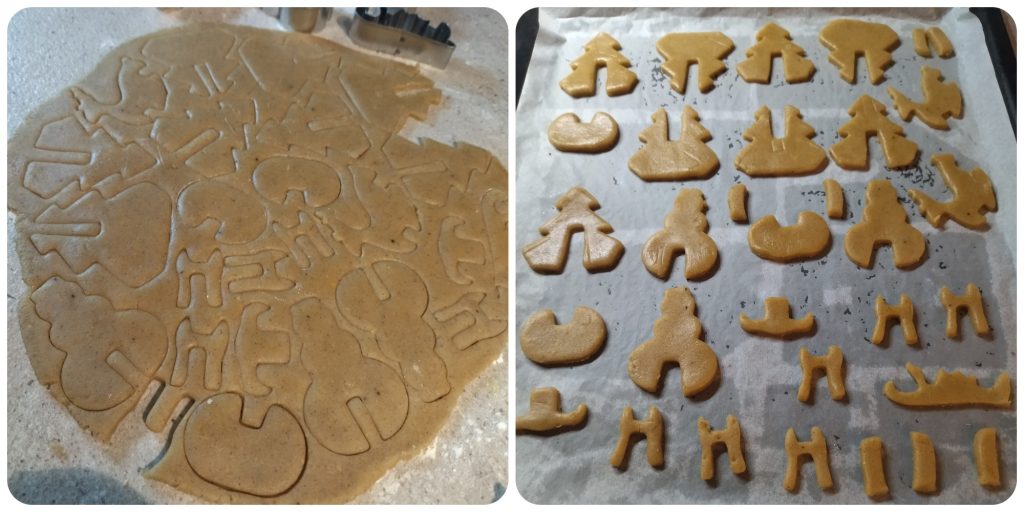 En la masa restante he recortado formas de galletas, para poner como paisaje alrededor de la casita. Colocad las galletas sobre la bandeja del horno cubierta con papel de horno