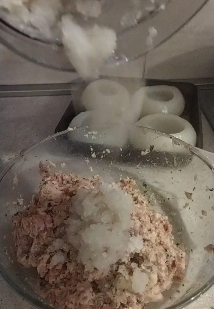 Obtuve aproximadamente 1 kg de relleno, con 500 g rellené los 4 anillos externos de cebolla, con el resto otros 8-9 anillos más pequeños, tomados del interior de la cebolla.