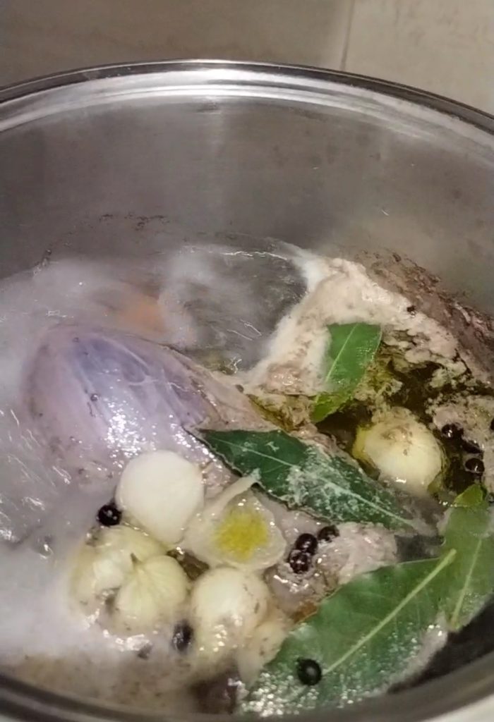 • En este punto, colocad la tapa y bajad el fuego al mínimo. Cocinad a fuego lento durante aproximadamente 3 horas, verificando que siempre haya un hervor muy suave. Si se forma grasa en la superficie, desespumadla con una espumadera y desechadla.