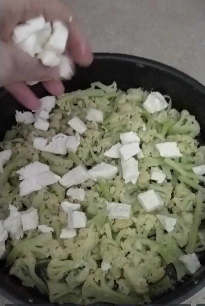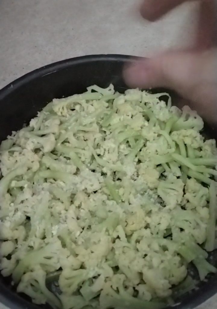 Unta con un poco de aceite una fuente de 26 cm de diámetro, coloca los coliflores hervidos en trozos no muy grandes, si es necesario sal a la superficie ligeramente. Si lo deseas, también puedes congelar los coliflores previamente hervidos para que estén listos para usar, en las notas te he escrito algunos pasos si quieres hacerlo tú.
