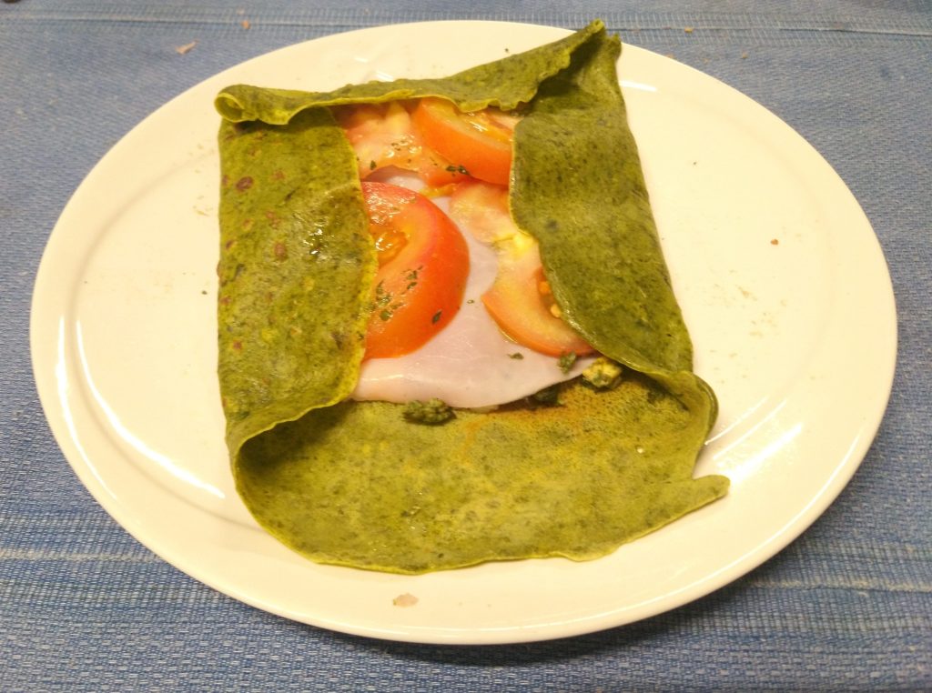 Coloca en la sartén especial una crepe, asegurándote de mantener la llama muy baja y comienza a condimentar la base colocando primero 4 rodajas de emmental, luego 2 cucharadas de la mezcla de huevos, 1 loncha de jamón cocido, 4 rodajas de tomate condimentadas con aceite, sal y orégano, un poco de ensalada.