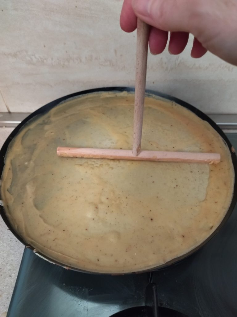 • Unta una sartén para crepes con mantequilla y vierte dos cucharones no llenos de masa, asegurándote de nivelarla bien. Cocina unos segundos por cada lado. Primero intenta cocinar los bordes, que serán un poco más gruesos, cuando la masa se aclare, despega los bordes y gira la crepe. Debes obtener unas 8 crepes.