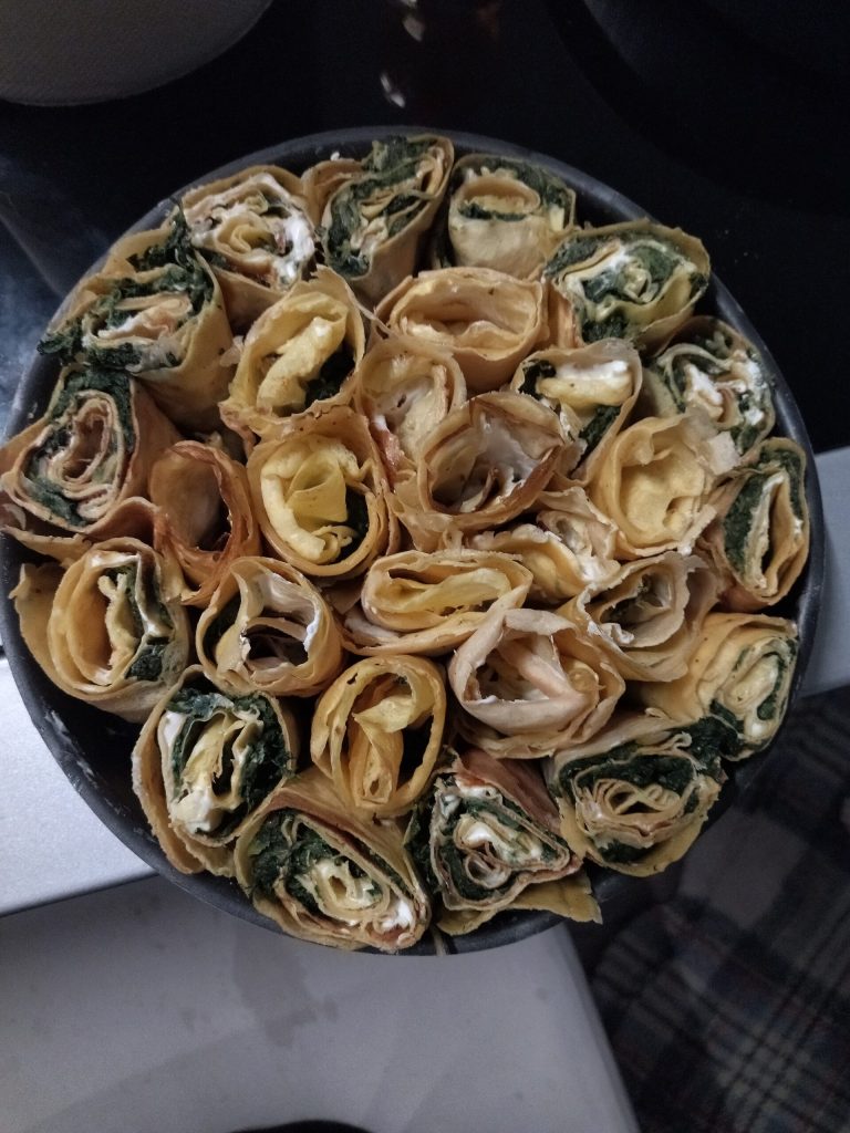 • Coloca una crepe sobre la superficie de trabajo, añade una capa de espinacas.
