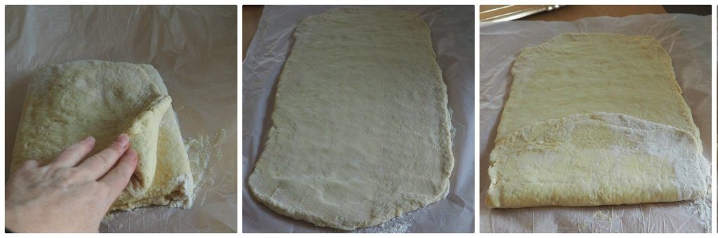 • Dobla nuevamente la masa: dobla la parte inferior hacia el centro y luego la parte superior siempre hacia el centro, luego dobla el bloque por la mitad (obtendrás así un pliegue a cuatro)