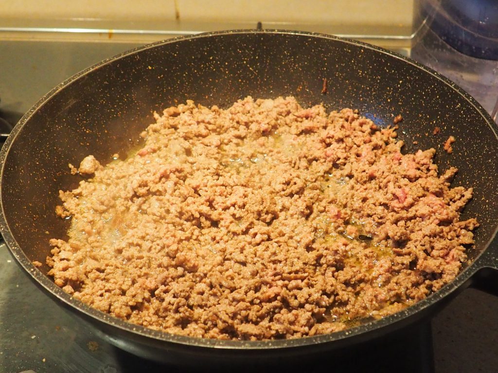 Poned el aceite en una sartén y sofreíd la carne picada durante 5 minutos.