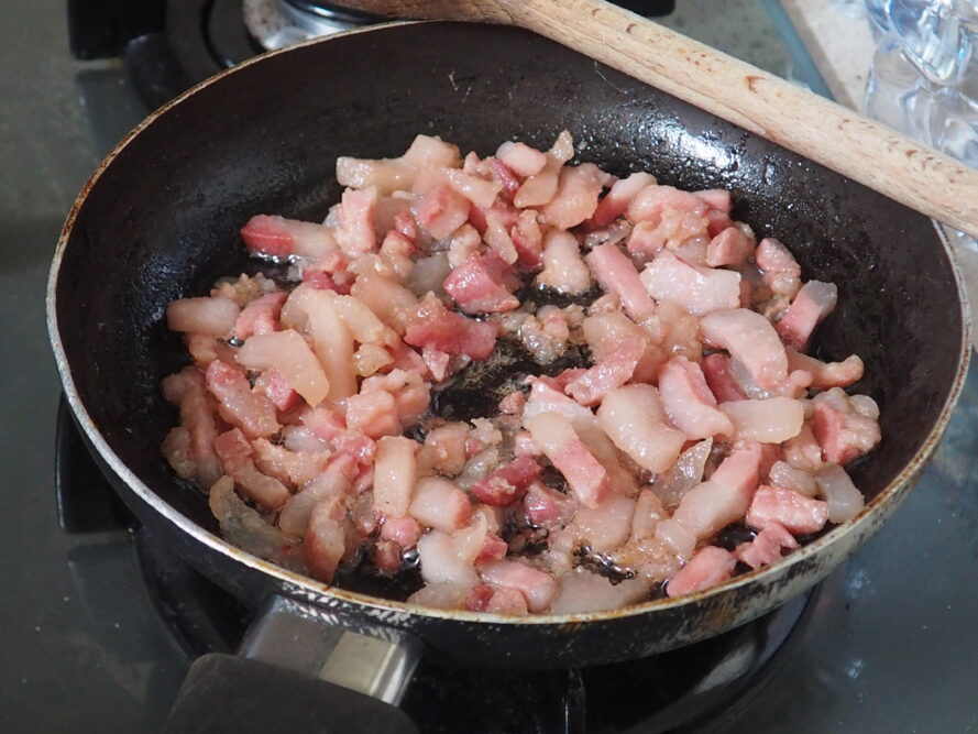 • En una sartén, dora la panceta, luego colócala en un plato para que se enfríe.