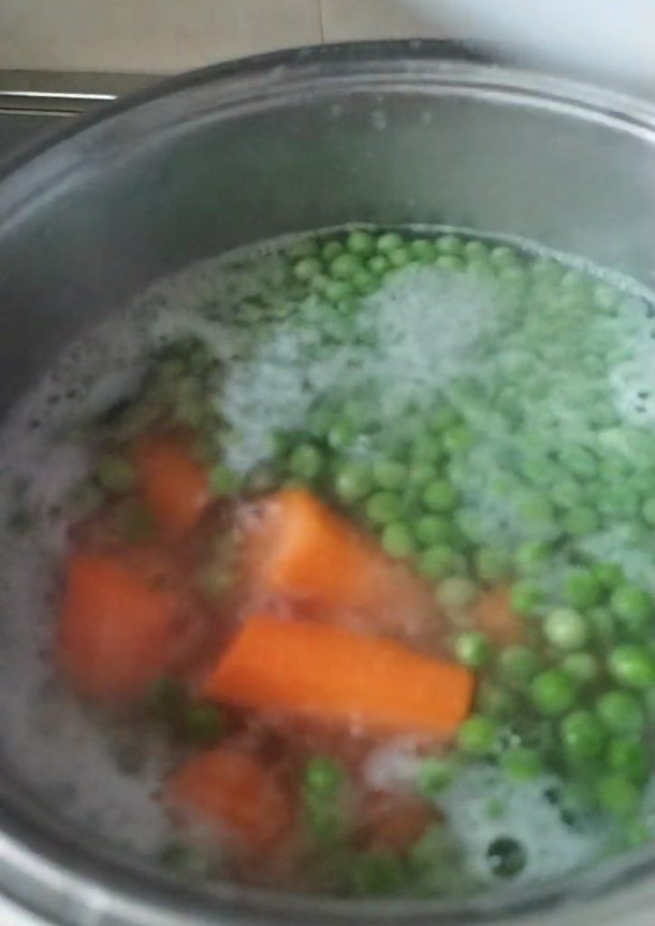 • En una olla pon aproximadamente 2 litros de agua, cuando hierva añade sal gruesa, una cucharada de aceite, la cebada perlada, los guisantes, las zanahorias limpias y cortadas en trozos grandes.