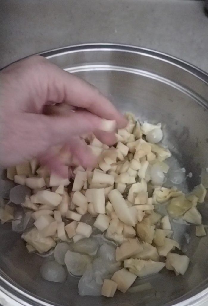 Corta la scamorza en dados bastante pequeños y añádela a las alcachofas y a las cebolletas.