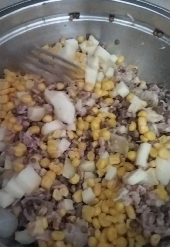 Completa el plato con maíz, si es necesario adereza con aceite de oliva, un poco de sal y pimienta. Mezcla bien y sirve frío.