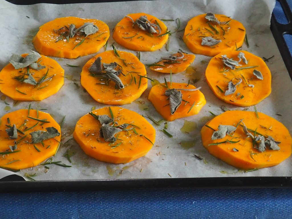 Córtala en rodajas, colócalas en la bandeja del horno forrada con papel de horno. Esparce un poco de sal en cada rodaja de calabaza, añade el romero, la salvia y el tomillo en la superficie (pon un trocito de cada sabor en cada rodaja). Rocía con un poco de aceite, deja reposar para que coja sabor durante unos 5 minutos.