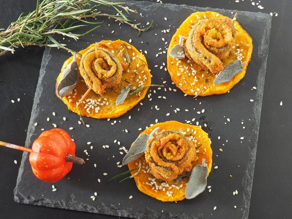 Coloque cada rollito de arenque sobre las rodajas de calabaza espolvoreadas con semillas de sésamo.