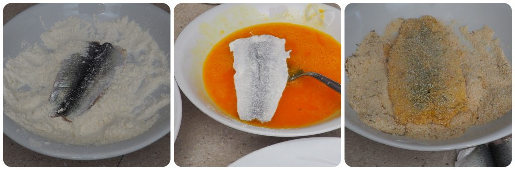 Pon en un plato la harina, en otro bate los huevos con la sal, en el tercero el pan rallado con el tomillo seco. Pasa los filetes primero por la harina, luego por el huevo y finalmente por el pan rallado.