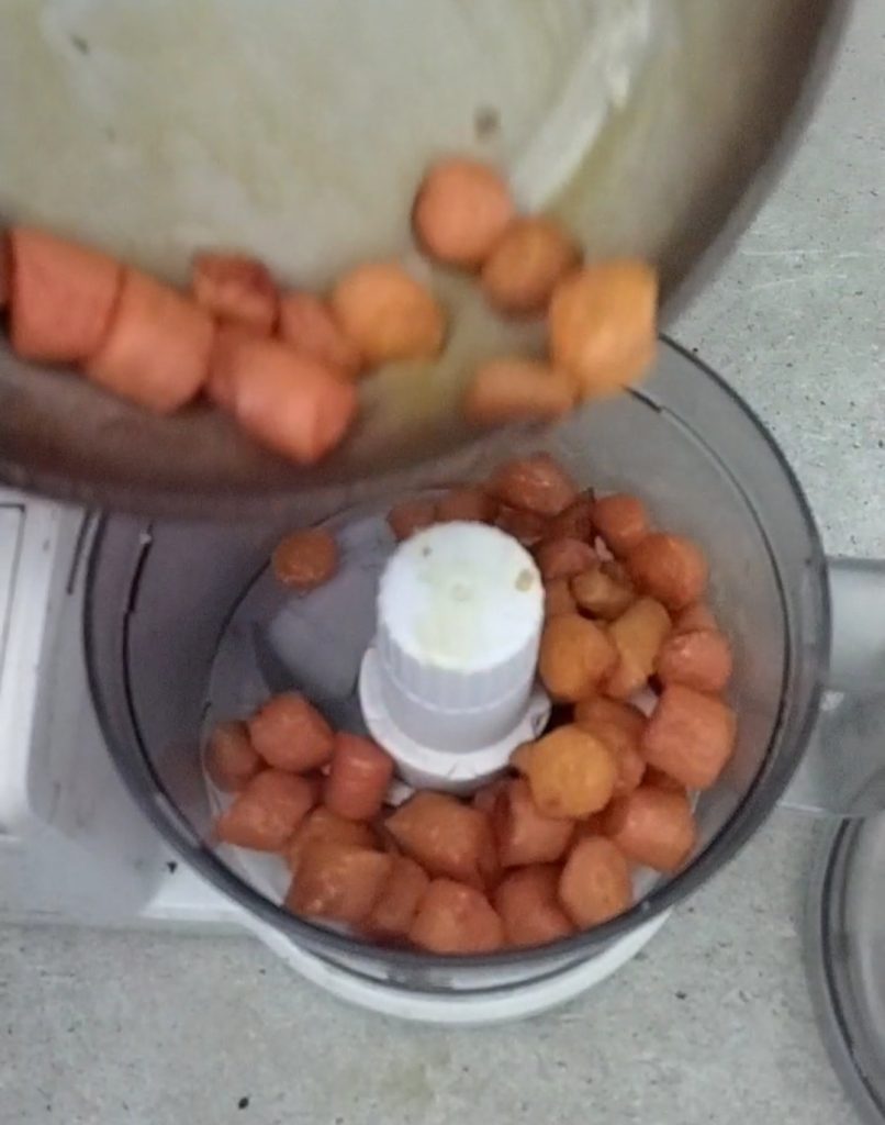 En una sartén con poco aceite, cocine las zanahorias previamente limpias y cortadas en rodajas durante aproximadamente media hora, deben quedar suaves. Ajuste de sal y deje enfriar. Alternativamente, puede hervirlas en una olla con abundante agua.