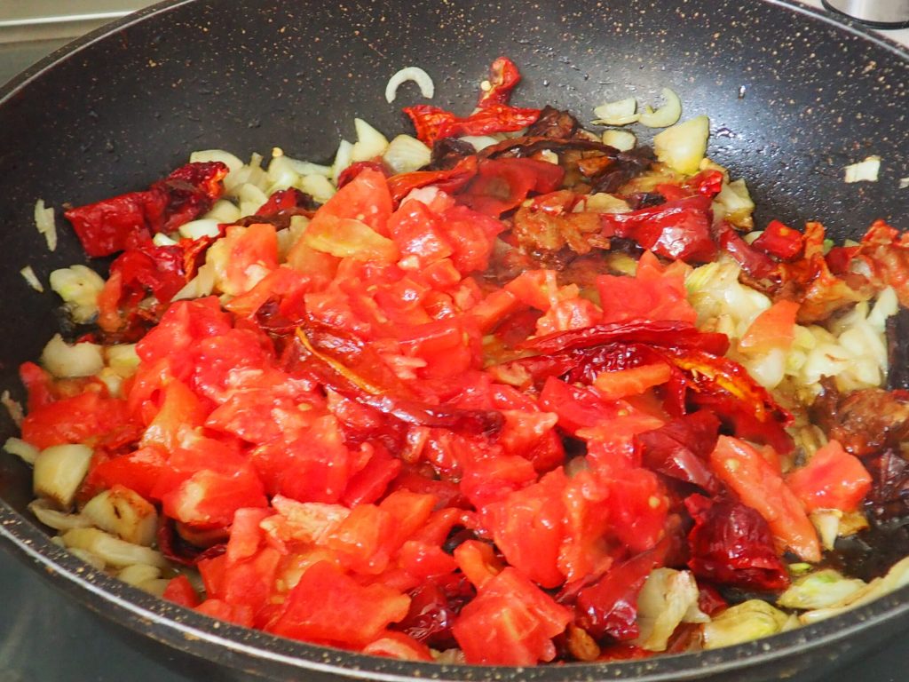 • Mezcla los ingredientes y después de unos cinco minutos añade los tomates lavados, a los que habrás retirado la piel y las semillas internas, cortados en cubitos. Añade sal y cocina durante unos 10 minutos. Si se seca demasiado, añade un poco de agua durante la cocción. Si es necesario, ajusta de sal.