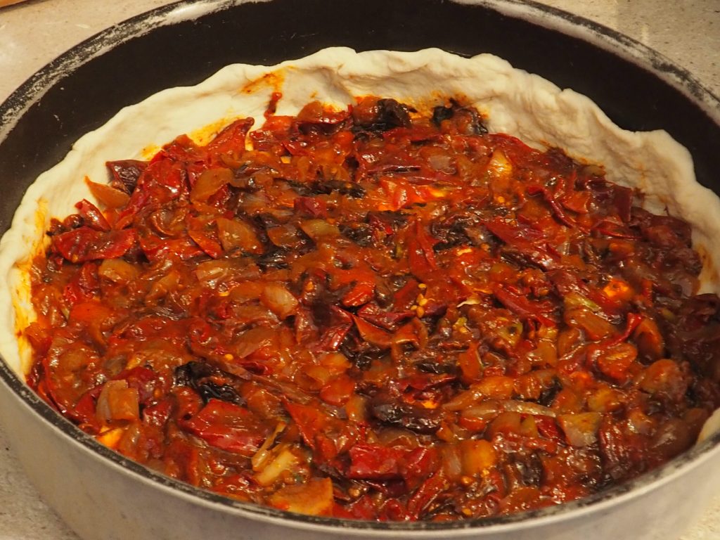 • En el molde, pon ahora el relleno de pimientos intentando extenderlo uniformemente.