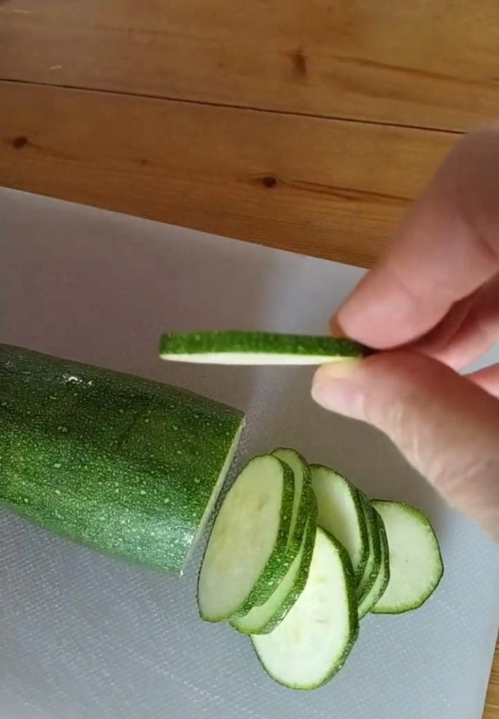 Lava los calabacines y córtalos en rodajas bastante finas con una mandolina o con un cuchillo.