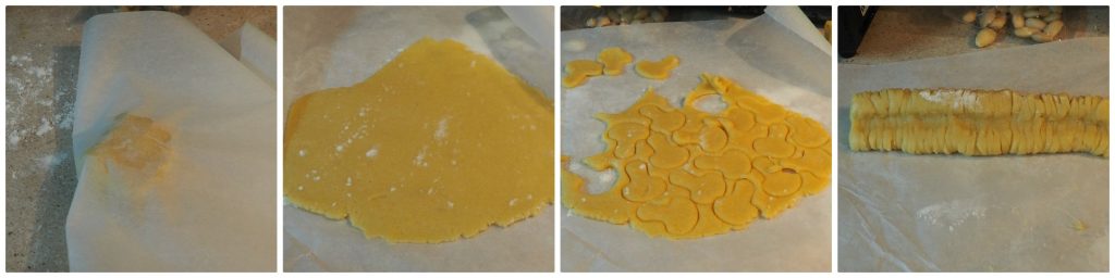 Ahora divide la masa en dos partes: una de 200 g y otra de 300 g. Coloca los 200 g de masa quebrada entre dos hojas de papel de horno y extiéndela con un rodillo hasta obtener un grosor de unos 3 mm. Con el cortador (yo usé uno de honguito de Navidad, que bien decorado parece una calavera). Crea una tira pegando una calavera a la otra, hasta unos 20 cm. Ponla en el congelador durante aproximadamente 30 minutos.