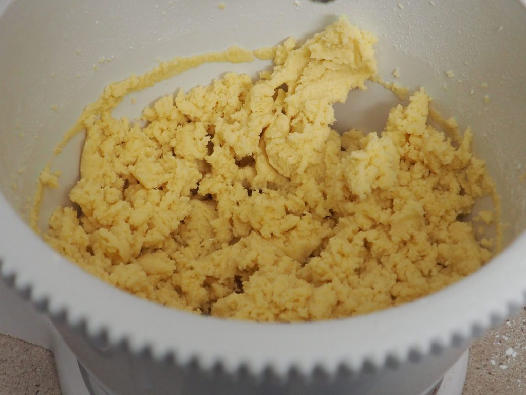 • Ahora añadid la harina 00 y el almidón de maíz y mezclad hasta que estén completamente incorporados. Quedará una mezcla ligeramente arenosa.