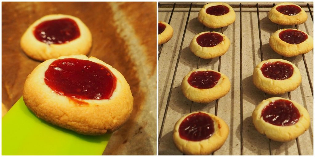 • Cubrid la bandeja del horno con papel de horno, colocad vuestras galletas y llenadlas con una cucharadita escasa de mermelada, elegid el sabor que prefiráis.