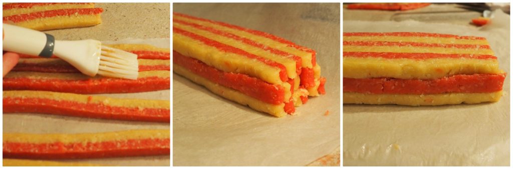 Ahora vuelve a pincelar la superficie con agua y azúcar, coloca encima otras 3 tiras con los colores alternados, humedece de nuevo la superficie con agua y azúcar y coloca encima otras 3 tiras siempre con colores alternados.