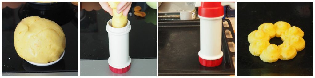 Toma la pistola para galletas, coloca el disco que prefieras, inserta una parte de la masa, dispara en vacío algunas veces, y cuando veas que la mezcla empieza a salir, posiciona la pistola en vertical con la parte del disco directamente sobre la bandeja del horno, sin papel de hornear, sin engrasarla con mantequilla ni nada, de otro modo las galletas no se pegarían.