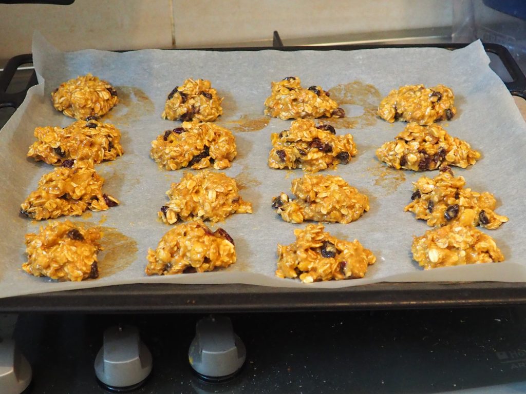 Toma ahora una cucharada de la mezcla (aproximadamente 30 g) y colócala en la bandeja del horno cubierta con papel de horno. Ayúdate con otra cuchara para dejar caer la mezcla si se queda pegada.
