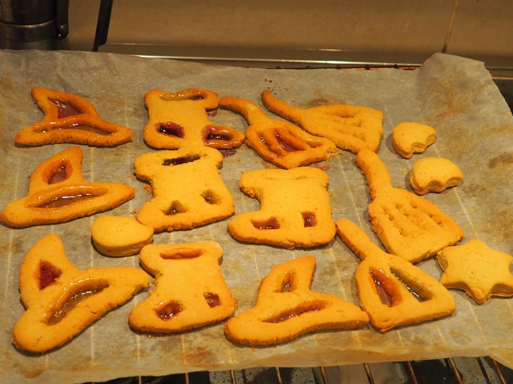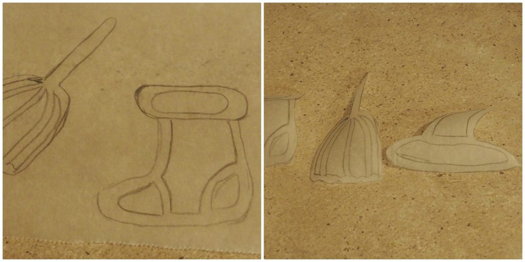• Como no tenía los cortadores adecuados, dibujé en papel de horno las figuras que quería reproducir como galletas: el sombrero, la escoba y la media de la Befana.