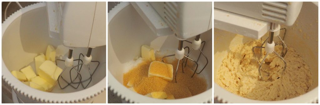 Pon tanto el azúcar blanco como el moreno en el recipiente de una batidora con las varillas montadas, añade la mantequilla ablandada y cortada en trozos, mezcla hasta que los ingredientes estén bien amalgamados.