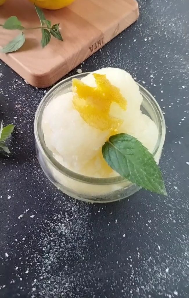 • Saca el recipiente del congelador, espera a que el compuesto se caliente un poco y mézclalo con un tenedor. Con una cuchara de helado, sirve el granizado, decorándolo con hojas de menta y las cáscaras de limón hervidas en el jarabe.