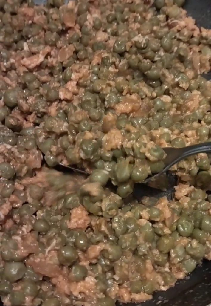 Hierve los guisantes en una olla con agua, sal y un poco de aceite de oliva. Una vez cocidos, pero no demasiado, deben estar un poco firmes, de lo contrario se desharán, escúrrelos. En una sartén pon un poco de aceite y sofríe la cebolla previamente lavada, limpia y cortada en trozos pequeños. En este punto añade los guisantes y cocina durante aproximadamente un minuto.