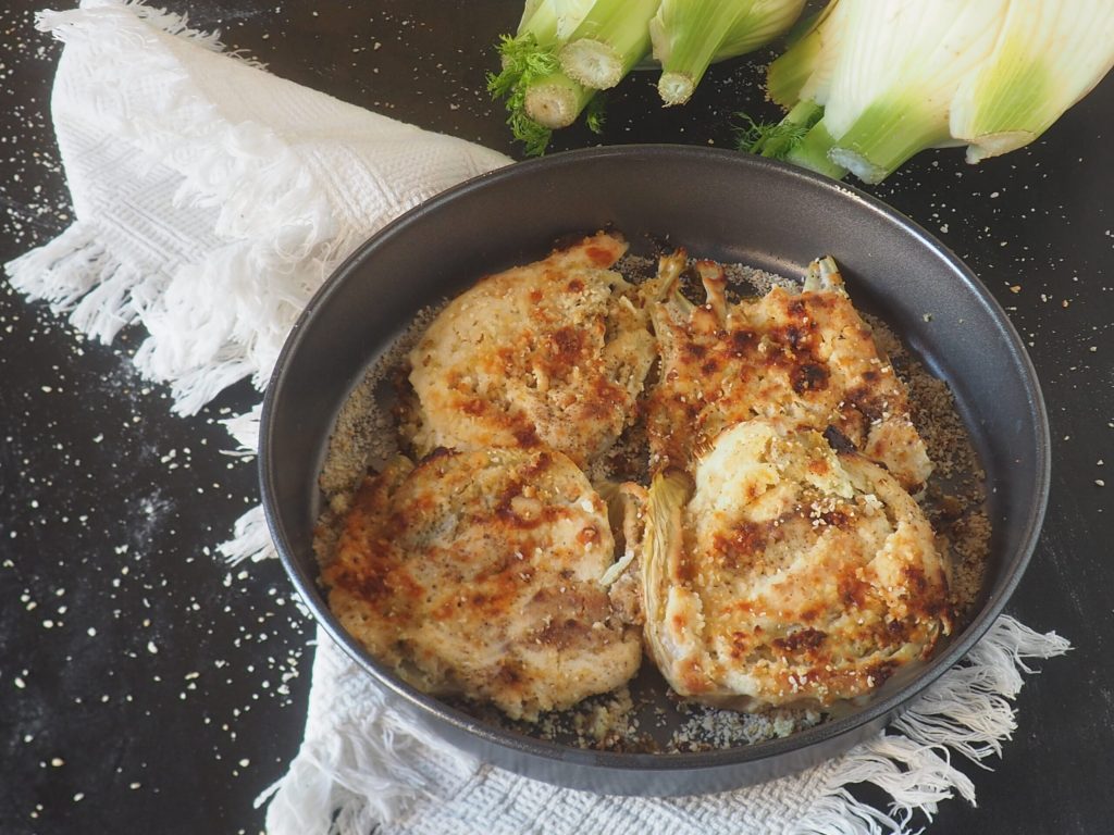 Espolvorea las rodajas de hinojo con la crema, luego pon encima parmesano rallado, pan rallado y una pizca de pimienta negra molida. Hornea a 180° durante unos 20 minutos, sube a 200° durante unos 10 minutos, y después gratina a 220° durante 5 minutos, asegurándote de que los hinojos no se quemen. Para estar seguro de que están cocidos, pínchalos con un tenedor para verificar que estén tiernos.