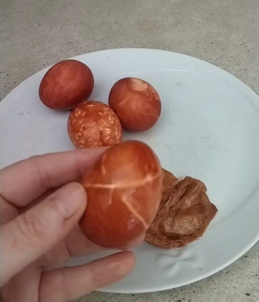Para realizar estos Huevos coloreados con colorantes naturales no he utilizado ningún colorante alimentario, sino simplemente cáscaras de cebolla. He visto varios videos que utilizaban este método, así que quise probarlo también y realmente me sorprendió el resultado. Necesitarás gasas y medias de nylon que ya no uses. Para decorarlas utilicé granos de arroz, hojas de ortiga y una goma elástica.