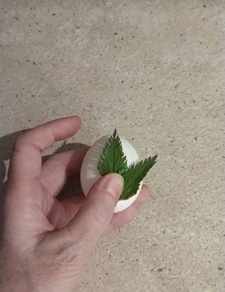 El tercer huevo crudo decóralo con hojas de ortiga.