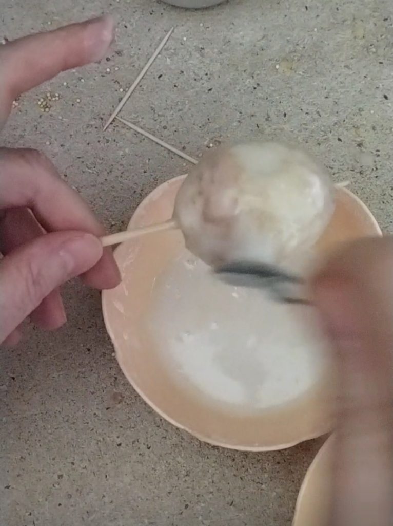 En el recipiente con más azúcar, deja el glaseado blanco. Para poder decorar mejor los huevos, te recomiendo que los pinches con un pincho de madera teniendo cuidado de no romperlos. Sumérgelos en el glaseado de agua, si no consigues cubrirlos bien, utiliza una cucharadita. Para tener un blanco más uniforme, pásalos en el glaseado dos o tres veces.