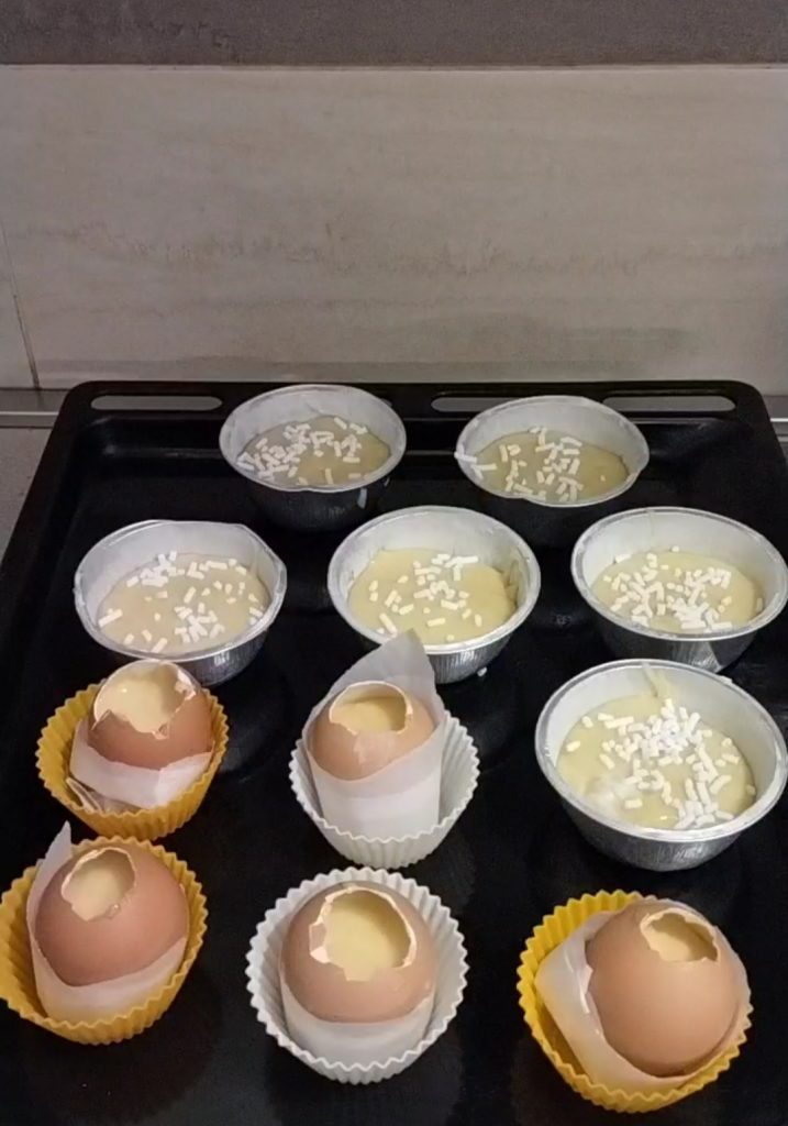 Si no tienes suficientes cáscaras, como me pasó a mí, puedes llenar moldes, no tendrán forma ovalada, pero serán igualmente deliciosos. Los moldes que utilicé tienen 4 cm de altura y 5,5 cm de diámetro, los he engrasado y enharinado previamente, luego los llené hasta la mitad, aproximadamente 4 cucharaditas. Para hacerlos más sabrosos, añadí una cucharadita de mermelada de melocotones y los decoré en la superficie con granillo de azúcar. Coloca ahora todos los moldes en la bandeja del horno. Si quieres usar solo cáscaras de huevo, necesitarás aproximadamente quince.