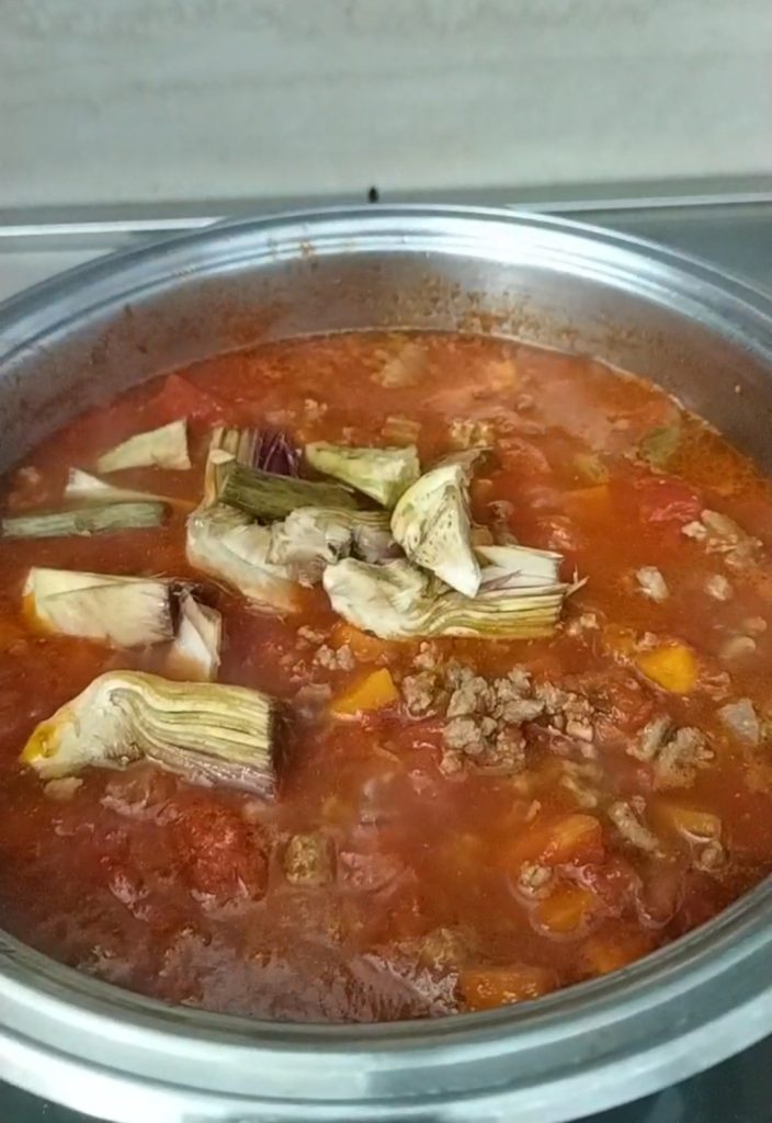 Lavad bien las zanahorias, las cebollas y el apio, picadlos finamente y sofreídlos en una olla con un poco de aceite. Agregad la carne picada, dejadla dorar, verted los tomates pelados, las alcachofas cortadas en 8 partes, salpimentad y cocinad durante una hora a fuego lento, no debe reducirse demasiado.
