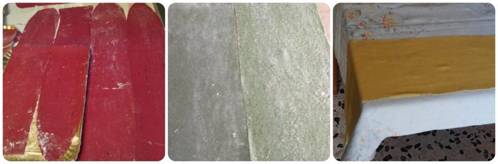 Extiende sobre una mesa enharinada las láminas tricolores, corta rectángulos de aproximadamente 17×12 cm.