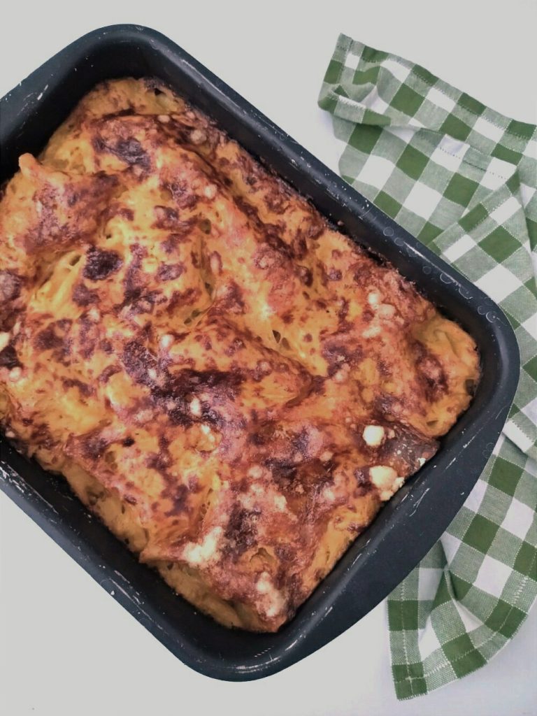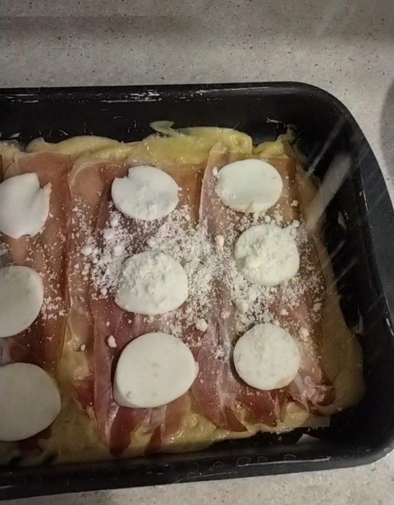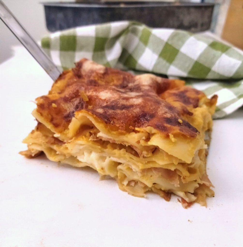 Continúa así, poniendo una nueva capa de lasañas, bechamel de calabaza, speck, Galbanino, parmesano. Haz 4 capas de lasañas y termina con la bechamel de calabaza y una pizca de parmesano