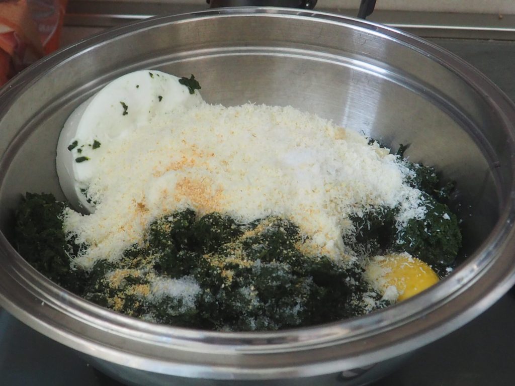 En un tazón grande, poned las espinacas picadas, el pan rallado, el pan de molde desmenuzado con las manos, 100 g de Parmigiano rallado, la sal, la pimienta, el ajo picado finamente, el requesón, los huevos y mezclad con las manos. Probáis y ajustáis de sal si es necesario.