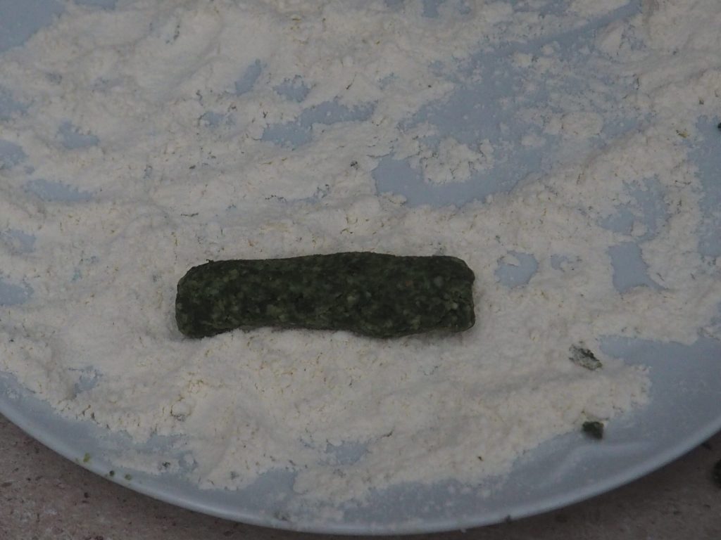 Tomad un poco de masa y cread cilindros de aproximadamente 5/6 centímetros de alto y del grosor de un dedo. Pasadlos por la harina.