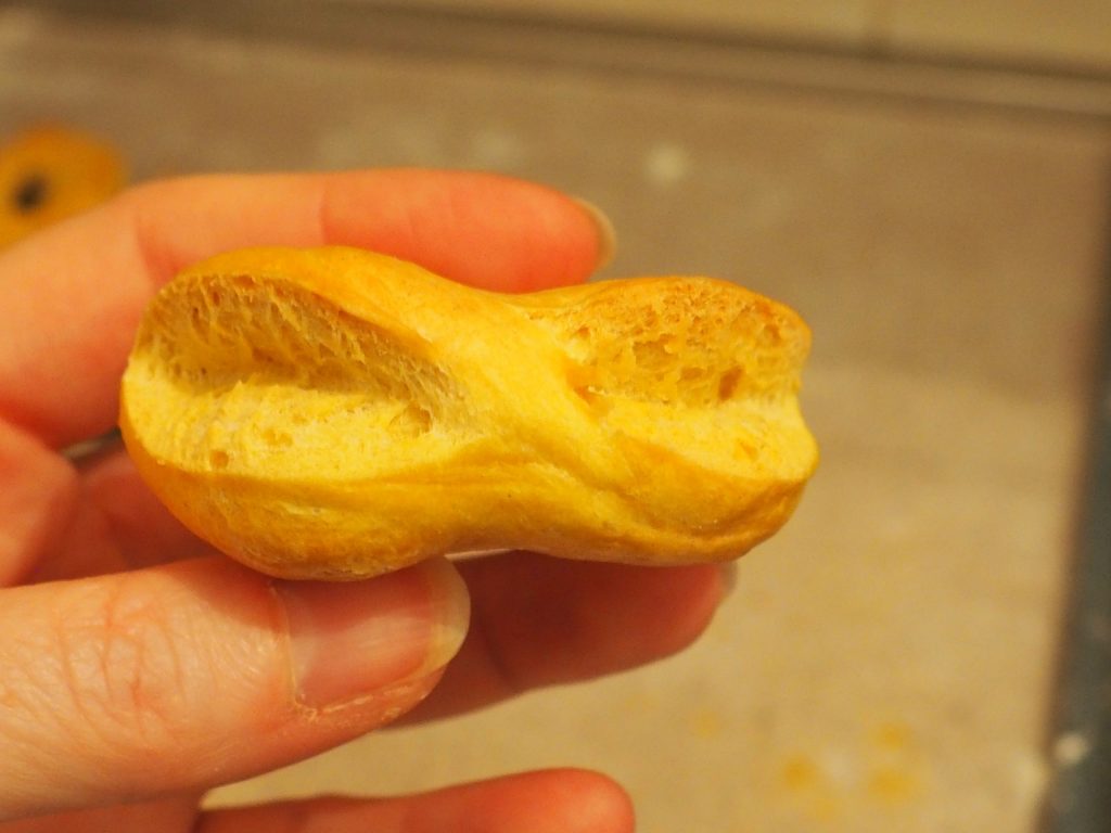 Gracias a los cortecitos hechos después de haberlas escaldado, las rosquillas quedan así tras el horneado.